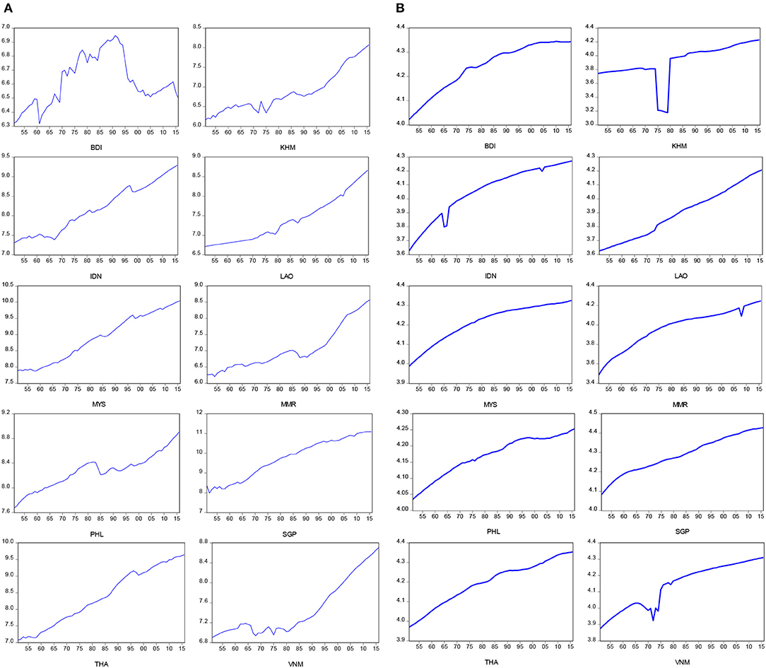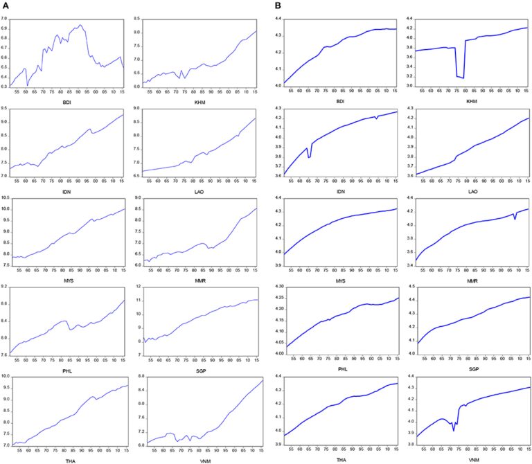 Figures 2A,B present time plots of the positive and negative components of life expectancy at birth, respectively. We found that the significant breaks of positive and negative components of life expectancy at birth appear during the periods of the Vietnam War (1965–1975) for Cambodia (KHM), Myanmar (MMR), Indonesia (IDN), and Vietnam (VNM), and the subprime loan crisis (2007–2009) for Laos (LAO). In addition, Figures 3A,B present time plots of the positive and negative components of real GDP per capita, respectively. The significant breaks of positive component of real GDP per capita were found during the periods of two oil crises (1973–1975, and 1980–1982) for Brunei (BDI), Cambodia (KHM), Indonesia (IDN), and Laos (LAO), while the significant breaks of negative component of real GDP per capita were identified found during the periods of the Vietnam War (1965–1975) for Cambodia (KHM), Myanmar (MMR), Indonesia (IDN), and Vietnam (VNM), the 1990s recession (1990–1992) for Laos (LAO), Myanmar (MMR), Philippines (PHL), and Asian financial crisis (1999–2000) for Brunei (BDI), Indonesia (IDN), Malaysia (MYS), Singapore (SGP), and Thailand (THA). In sum, the upward trends of the negative components of life expectancy at birth were found in almost all ASEAN countries, except for Cambodia (KHM) and Vietnam (VNM). The negative components of real GDP per capita showed upward trends in Laos (LAO), Malaysia (MYS), and Thailand (THA) and downward trends in Brunei (BDI) and Cambodia (KHM). The negative components of real GDP per capita exhibited a U-shape in Indonesia (IDN), Myanmar (MMR), Singapore (SGP), and Vietnam (VNM) and an inverted U-shape in Philippines (PHL).