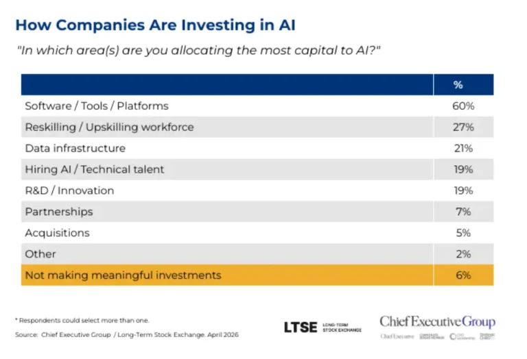 Retraining and upskilling existing employees lags far behind at 27%, indicating that workforce development is a secondary focus so far. Investment in R&D and new AI or technical talent is 19% each.