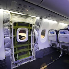 The door plug area of Alaska Airlines Boeing 737 MAX 9 aircraft awaits inspection on January 10, 2024.