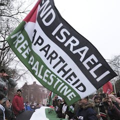 A demonstrator waves a Palestinian flag during a demonstration in front of the International Court of Justice in The Hague, Netherlands, on January 11, 2024. The United Nations Supreme Court has begun hearings into South Africa's claim that Israel's war with Hamas constitutes genocide against the Palestinian people.